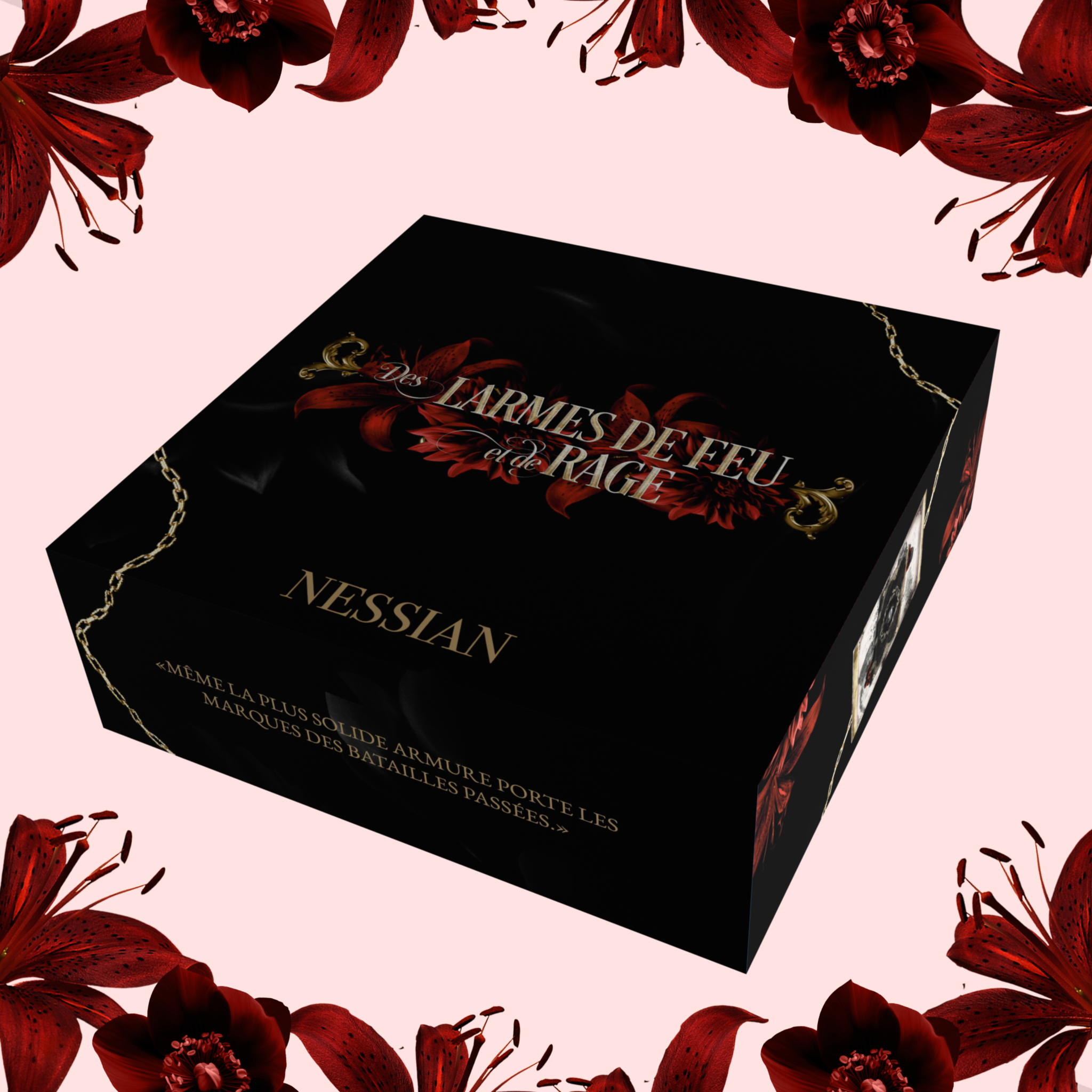 Contenu de la box : carnet de notes (avec dorure et jaspage), deux marque-pages (dont un illustré par @giannyfili), deux overlays illustrés par @giannyfili, des protège-coins pour le livre, le livre relié, des graines de lys Susan Forever.